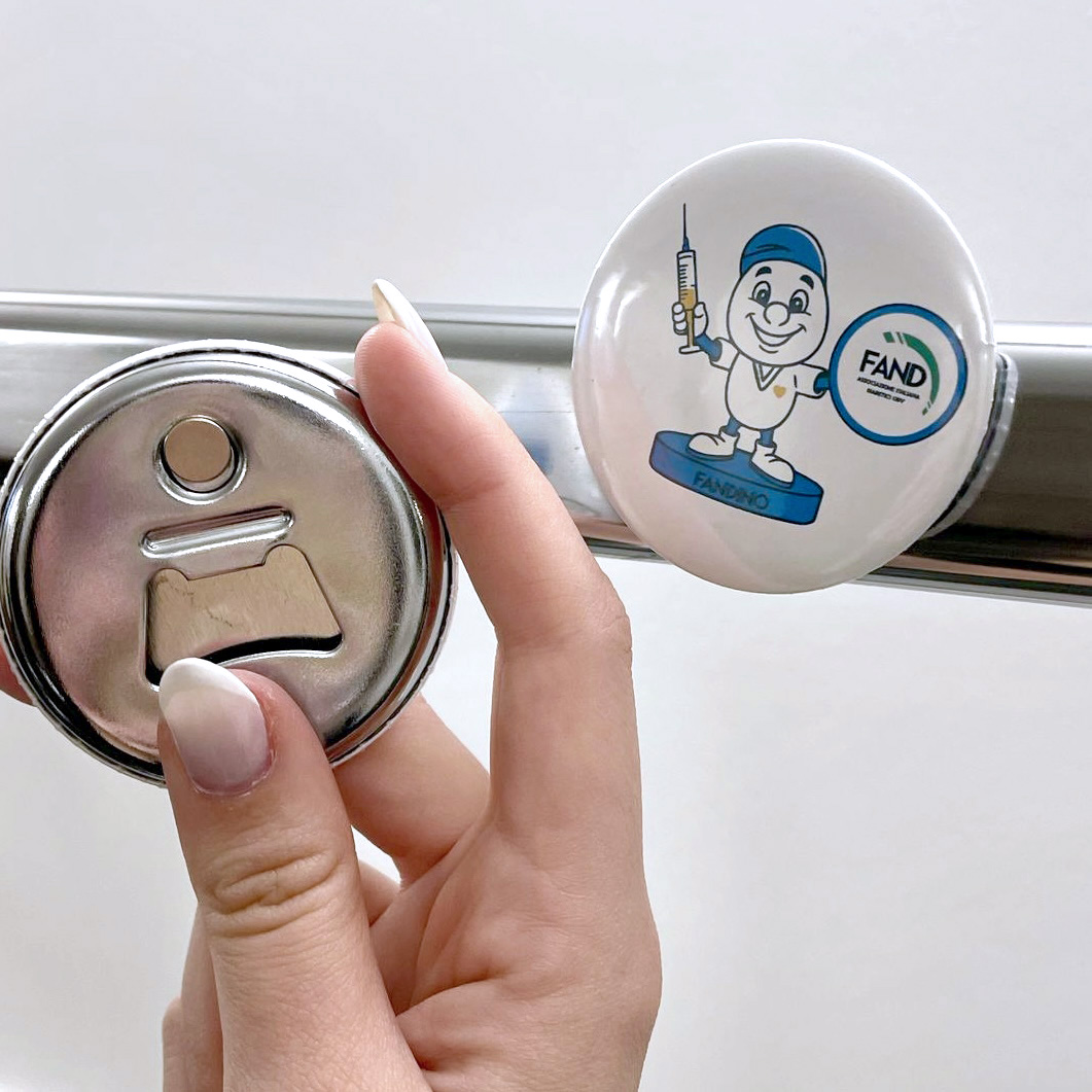 Spilla a bottone magnetica con apribottiglie, diametro 5,8 cm con la stampa a Edizione Limitata di Fandino 1.0.